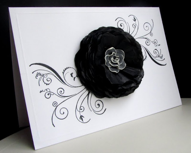 White cardstock, black tissu paper, stamp: Artemio swirls, Tsukineko jet black, rose: a button